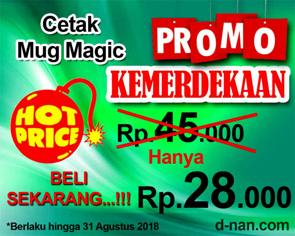 Promo Kemerdekaan, cetak Mug Magic. Mug bunglon. Mug Bisa Berubah warna saat di isi air panas. Sekarang hanya Rp. 28.000 . Dengan Mug Magic souvenir anda makin berkesan. silakan hubungi Customer Service D-Nan Store surabaya untuk Promo Mug Souvenir Agustus 2008 di Nomer. 0811.3197.957 HP/WA. Yang mau Berkunjung langsung ke workshop D-Nan Store bisa melihat di Peta D-Nan